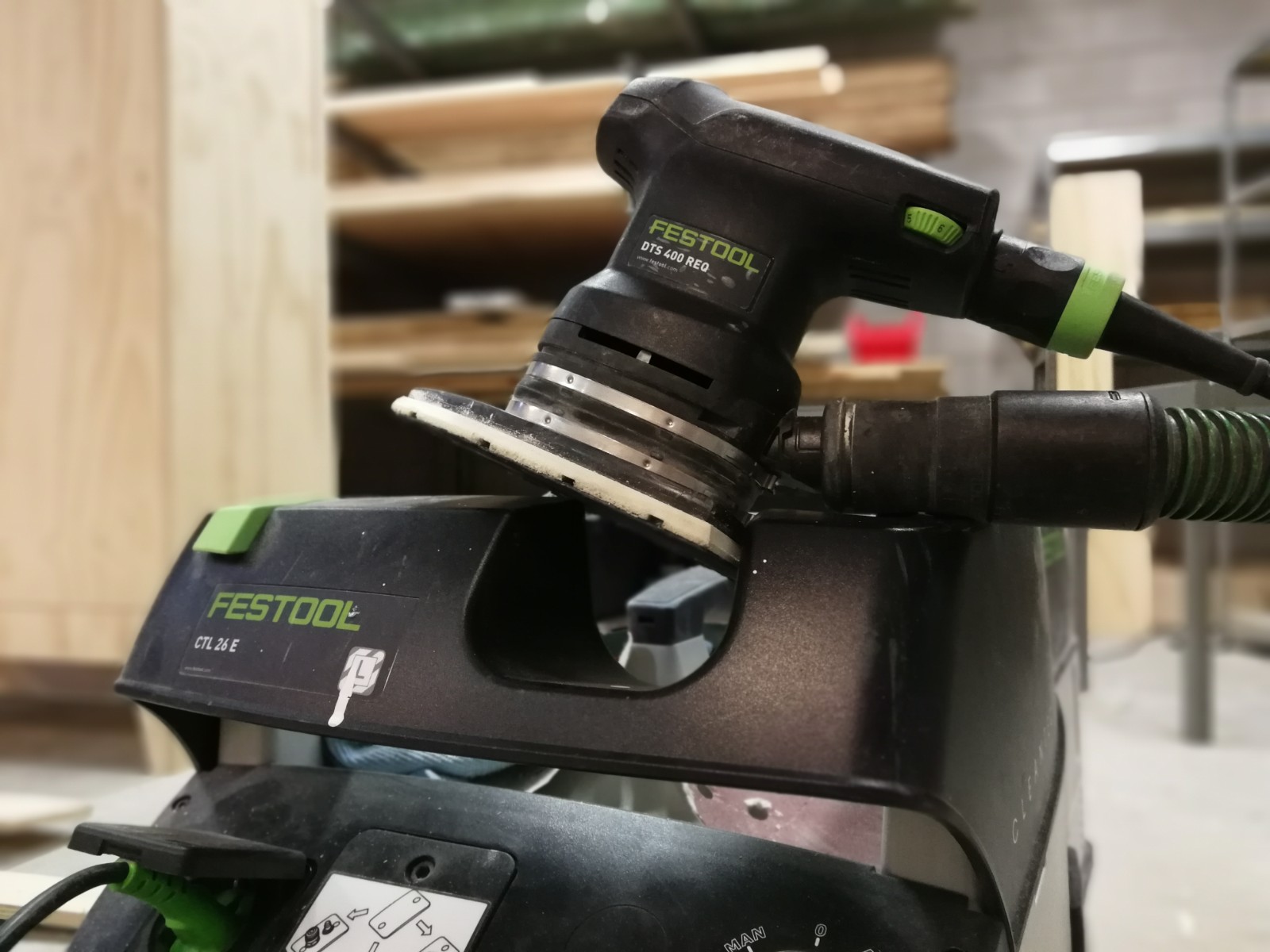 Gezien de grote vlakken is een schuurmachine geen luxe. Schuur bij voorkeur met een schuurmachine met stofafzuiging of in ieder geval een stofzak of stofbox met microfilter. Stof is nooit fijn.